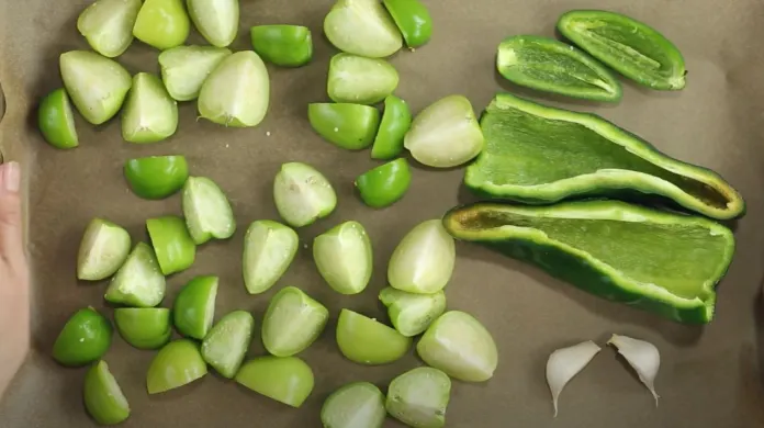 - 将番茄、墨西哥胡椒、波布兰诺辣椒和未剥皮的蒜瓣放在烤盘上,放入烤箱烤 5 到 10 分钟或直至完全烧焦。