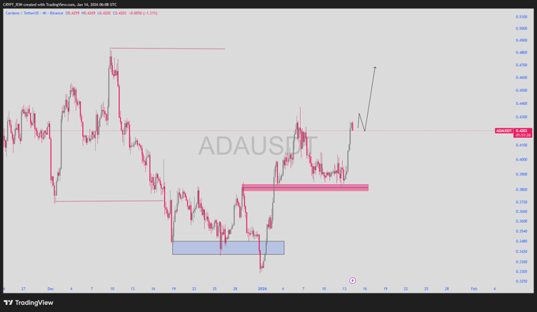 According to Cardano’s (ADA) recent crypto analysis, on-chain metrics are improving, such as the expansion of smart contracts, rising participation in decentralized applications (dApps), and stable staking activity. Cardano’s recent strength was evident after a strong rebound from the major support zone of $0.32-$0.34, which held at the end of 2025.