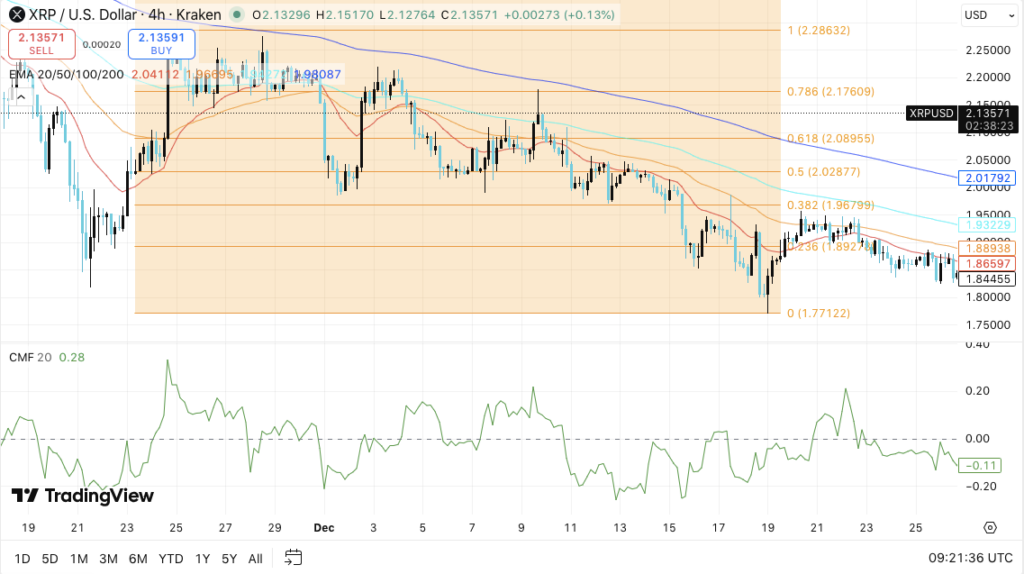 Technical indicators remain cautious as the XRP chart shows lower highs on the 4-hour chart and the price remains below key moving averages. Supply zones are forming between $1.93 and $1.95, while resistance is building in the $2.02 to $2.18 zone.